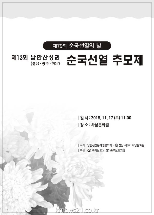 제79회 순국선열의 날(11.17)을 맞이하여, 남한산성 문화권 협의회(성남·광주·하남 문화원)이 주최하는 「제13회, 남한산성권 순국선열 추모제」가, 경기동부 보훈지청 후원으로 11.17(토) 오전 11시 하남문화원 3층 강당에서 개최한다.