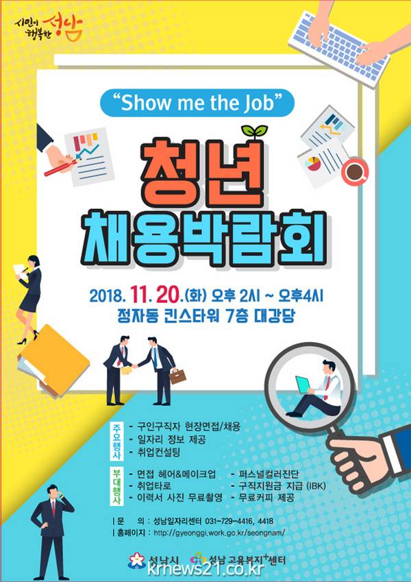 성남시(시장 은수미)는 오는 11월 20일 오후 2시~4시 분당구 정자동 킨스타워 7층 대강당에서 ‘청년 채용박람회’를 연다.