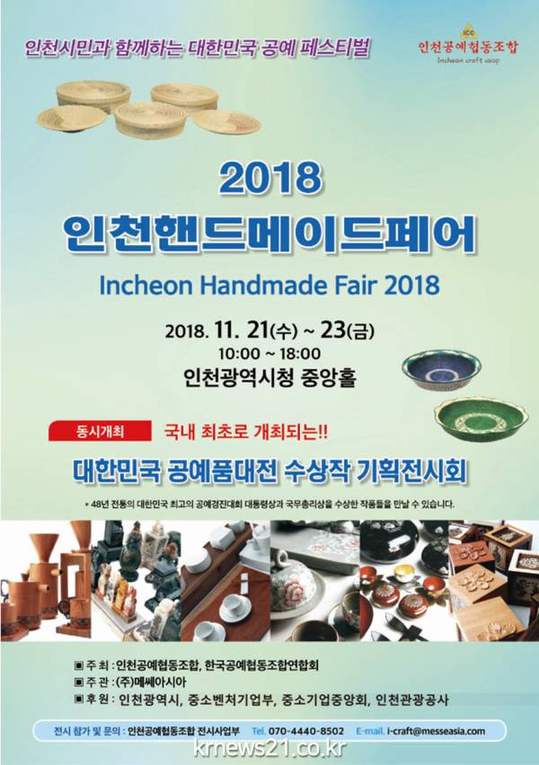 ▲ (사진=인천광역시청)인천시(시장 박남춘)는 오는 11월 21일부터 23일까지 3일간 인천시민과 함께하는 대한민국 공예 페스티벌 ‘대한민국공예품대전 수상작 전시 및 2018 핸드메이드페어’를 인천시청(중앙홀)에서 개최한다고 밝혔다.