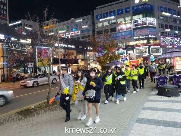 김포경찰서(총경 강복순)는 11.15(목) 김포시 구래동 일대 청소년 밀집 지역 중심으로 수능 후 청소년 비행 예방을 위한 유관기관 합동 선도·보호를 위한 활동을 펼쳤다.이날 행사는 여성청소년과 학교전담경찰관, 김포시청 아동청년과, 청소년육성회 유해환경감시단, 김포시 청소년 상담복지센터, 어머니·학부모 폴리스 등 청소년 유관기관 40여명이 참석했다.