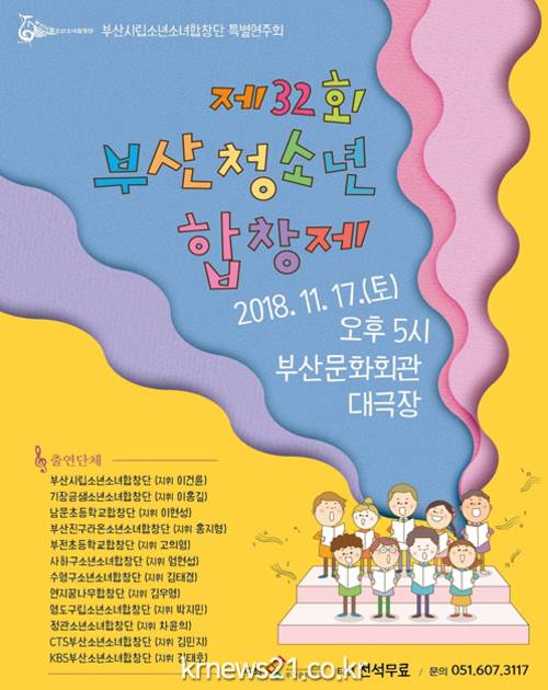 제32회 부산청소년합창제는 매년 개최되는 부산시립소년소녀합창단의 특별연주회로 만5세 이상의 관객이라면 입장권 없이 무료로 감상할 수 있다.