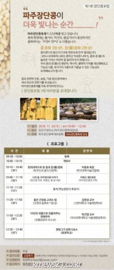 제1회 ‘장단콩포럼’의 내용은 다음과 같다. 1강은 현대과학이 보는 콩과 장(醬)문화, 2강은 나의 콩 파주장단콩이야기, 3강은 좋은 간장을 고르는 법, 4강은 전통된장의 우수성, 마지막은 장 담그기 Q&A 시간이다.