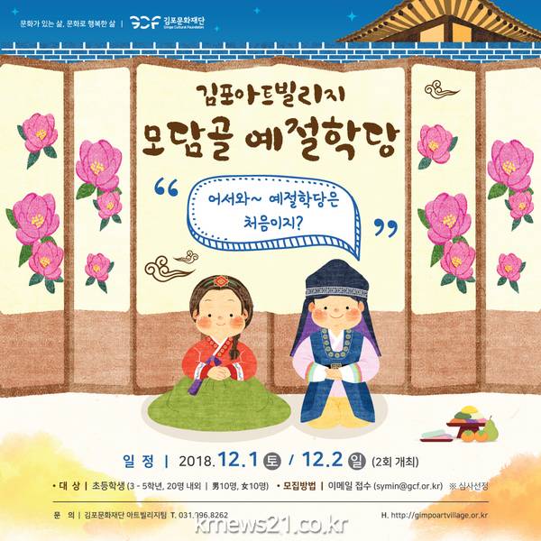 한편 ‘모담골 예절학당’의 참가비는 10,000원이며, 자세한 문의는 김포문화재단 아트빌리지팀(031-996-8262)으로 하면 된다.
