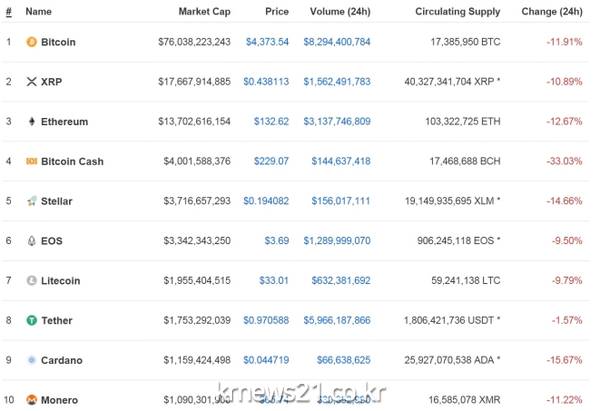 ▲ (사진=코인마켓캡 갈무리)비트코인 가격이 13개월 보름여만에 처음으로 4200달러까지 급락하면서 암호화폐 관련주도 일제히 하락했다.