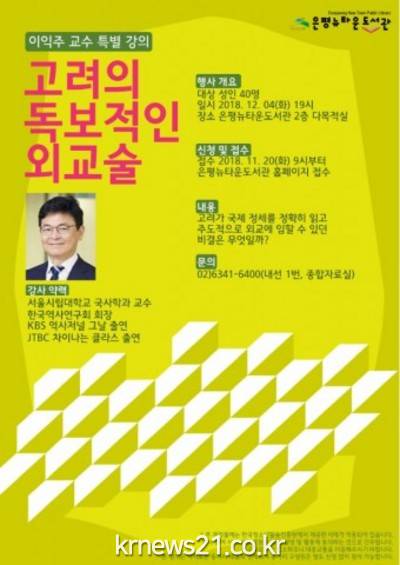 구립은평뉴타운도서관(관장 박종범)은 12월 4일(화) 오후 7시부터 9시까지 도서관의 성인 이용자 40여명을 대상으로 ‘이익주 교수 특별 강의 <고려의 독보적인 외교술>’을 진행한다.
