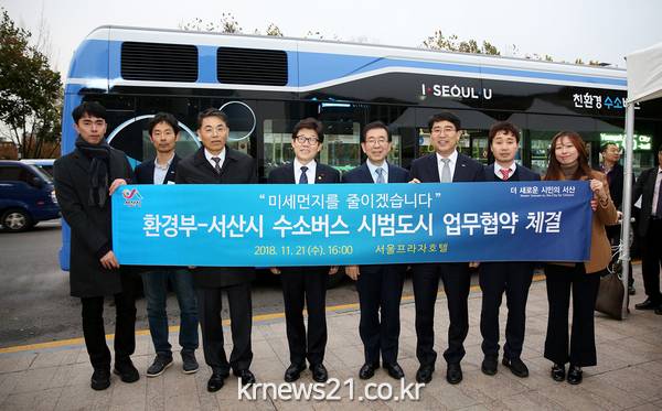 지난 21일 서울 플라자호텔에서 서산시는 환경부와 산업통상자원부, 국토교통부 등 관계 장관과 맹정호 시장 등 6개 수소버스 시범도시 단체장, 현대자동차 사장이 모여 ‘수소버스 보급 확산을 위한 상호협력에 관한 업무협약’을 체결했다.