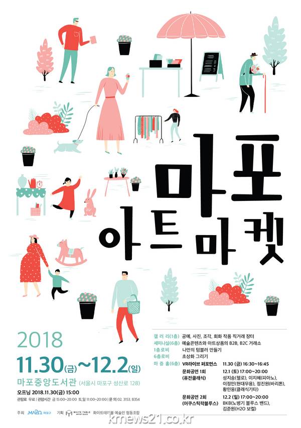 마포구(구청장 유동균)는 미술콘텐츠의 플랫폼을 구축하기 위한 문화예술진흥 중장기 사업의 첫 행사로 <2018 마포아트마켓>이 오는 11월 30일(금)부터 12월 2일(일)까지 마포중앙도서관에서 열린다고 밝혔다.