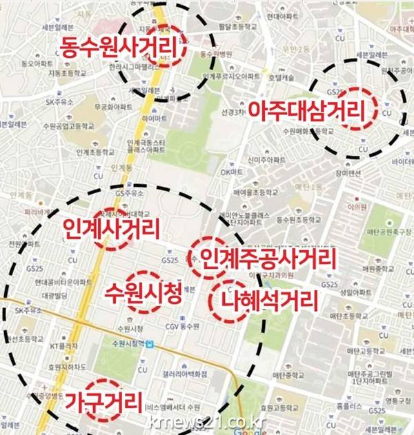 분석 결과 2016년 12월~2017년 3월까지 수원시 도심에서 떼까마귀가 가장 많이 출몰했던 지역은 동수원사거리(35회)였고, 인계사거리(15회), 나혜석 거리·인계동 박스(8회), 가구거리·인계주공사거리(7회), 아주대삼거리(5회)가 뒤를 이었다.