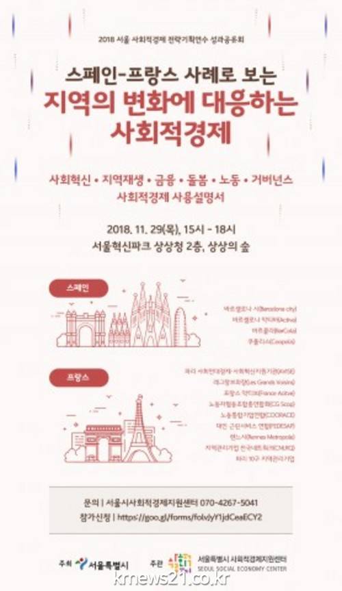 이번 성과공유회는 스페인·프랑스 사회적경제 선진 사례에 관심 있는 사람 누구나 참여할 수 있으며, 신청은 서울시사회적경제지원센터 누리집에서 할 수 있다.