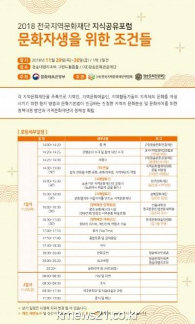 △차재근 지역문화협력위원회 위원장의 기조연설 ‘삶의 전환을 위한 문화, 문화적 재생, 지역재단의 역할’ △‘농촌기반 지역문화재단의 길찾기(송은정 완주문화재단 사무국장)’ △‘문화협치와 마을자치를 만드는 지역문화재단(김진만 성북문화재단 팀장)’ 성공사례발표 △‘지역문화교육은 무엇인가’라는 주제로 지역의 문화전문인력 양성과 활용(안동대학교 한국문화산업전문대학원 김진희 교수) △‘정부와 지자체, 재단간의 역할과 기능’이란 정책제안(김기봉 한국문화예술위원회 위원) 순으로 발표가 진행되며, 의견을 나누는 종합토론 등으로 프로그램을 진행할 예정이다.