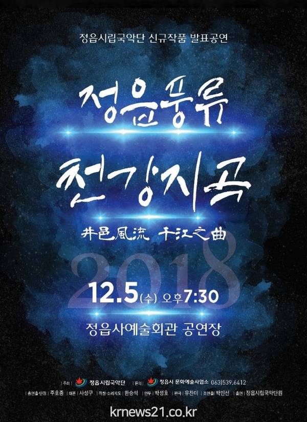 정읍시립국악단(단장 주호종, 이하 시립국악단)의 신규작품 발표공연 “정읍풍류 천강지곡” 이 오는 12월 5일(수) 밤 7시 30분에 정읍사예술회관 공연장에서 펼쳐진다.
