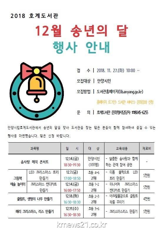 동시에 관양도서관에서는 크리스마스 리스 만들기, ‘신통방통 세 가지 말’ 김경희 작가의 1인극 공연 등이 열린다. 또 비산도서관에서는 샌드아트 체험 공연, 영어 스토리텔링 특강, 연필스케치 수강생 작품 전시 등이 준비되어있다.