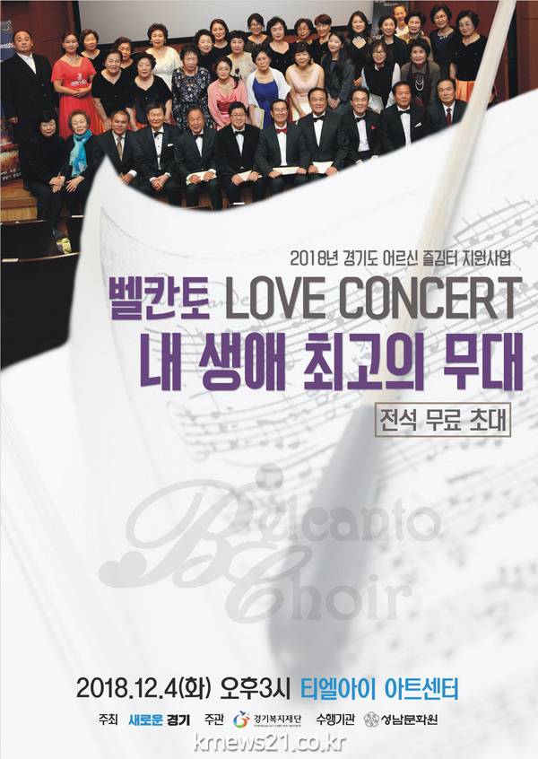 2018 경기도 어르신 즐김터 지원사업으로, 성남문화원(원장 김대진)이 수행하고, 경기도 주최, 경기복지재단이 주관하는 ‘벨칸토 LOVE CONCERT – 내 생애 최고의 무대’가 12. 4 (화) 오후3시, 성남시청 앞 티엘아이 아트센터에서 개최된다.