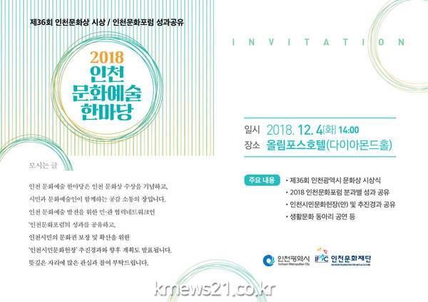이날 행사에서는 향후 인천문화예술계의 이정표가 될 ‘인천시민문화헌장(안)’의 추진경과와 향후계획이 발표된다. 또한 인천 문화예술진흥과 지역사회발전에 기여한 시민을 포상하고 업적을 알리는 ‘ 제36회 인천광역시 문화상 시상식’도 함께 진행할 예정이다.