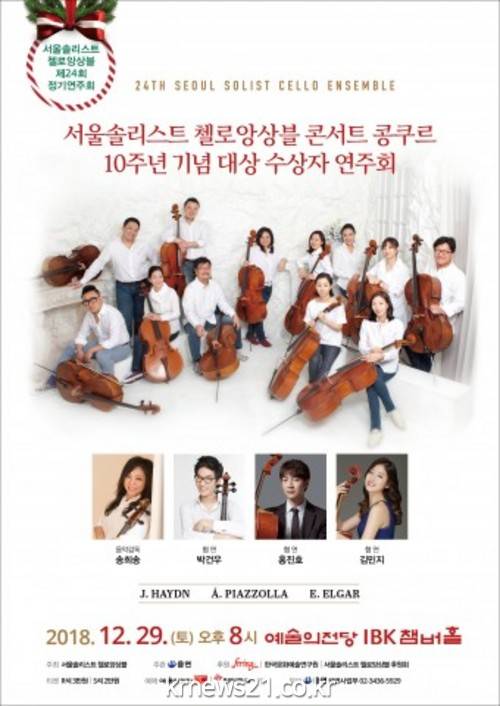 서울솔리스트 첼로앙상블이 10주년 콘서트 콩쿠르 대상 수상자 연주회를 12월 29일(토) 오후 8시, 예술의전당 IBK 챔버홀에서 개최한다. 첼리스트 홍진호, 김민지, 박건우의 협연으로 J. Haydn, A. Piazzolla, E. Elgar, G. Bizet의 작품을 연주할 예정이다.