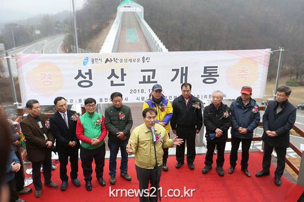 용인시는 3일 영동고속도로를 횡단해 기흥구 동백동과 처인구 포곡읍 사이의 석성산~할미산성을 연결하는 보도교인‘성산교’를 완공해 개통식을 열었다.