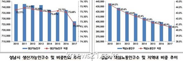 최근 성남상공회의소(회장 박용후)의 분석 자료에 따르면 성남시의 주민등록인구는 2017년 현재 967,510명으로 2010년 대비 1.29% 감소하였고 특히, 15~64세까지의 생산가능인구는 동기간 동안 2.03% 감소하여 생산가능인구의 감소 폭이 성남시 총인구 감소 폭보다 더 큰 것으로 조사되었다.
