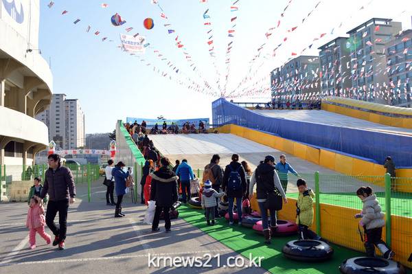 눈썰매장은 성남종합운동장 주차장에 각각 9레인의 성인용 슬로프(17m*50m)와 유아용 슬로프(14m*30m) 등 2개 코스를 조성했다.
