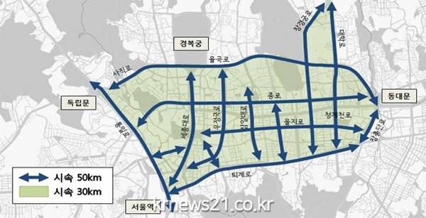 이번에 차량제한속도가 하향되는 도로는 사직로~율곡로~창경궁로~대학로~장충단로~퇴계로~통일로로 둘러싸인 사대문 안과 청계천로 전체구간(청계1가~서울시설공단 교차로)이다.