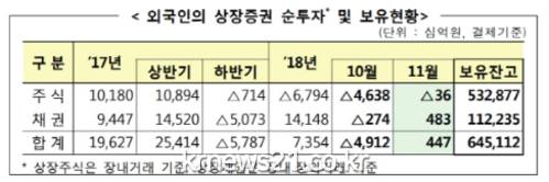 금감원 관계자는 "외국인의 국내 주식 투자는 지난 10월에 이어 순매도가 지속됐으나 보유 잔고는 늘었고, 채권은 올해 10월 순유출에서 순투자로 전환하며 역시 보유 잔고가 증가했다"고 말했다.
