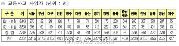 올해 1월부터 11월까지 교통사고 사망자 수는 잠정적으로 2017년 같은 기간에 비해 10.1% 감소한 3443명으로 집계됐다.