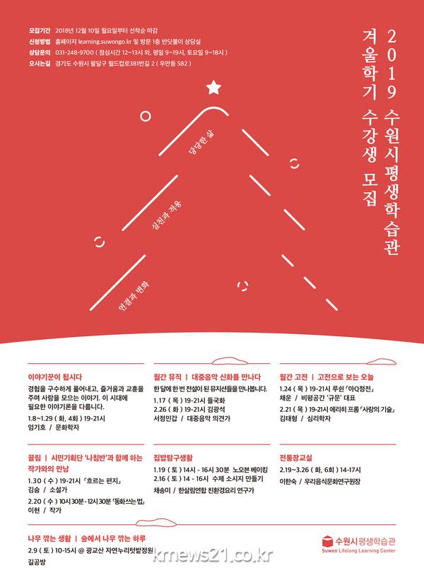 수원시평생학습관이 ‘겨울학기 강좌’ 수강생을 모집한다.