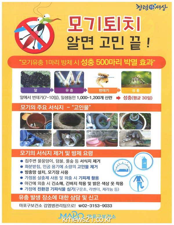 유충서식지를 발견할 경우 마포구보건소 보건행정과(☎3153-9033)로 연락하면 방역기동반이 현장을 방문해 모기유충실태조사와 함께 방역을 실시한다.