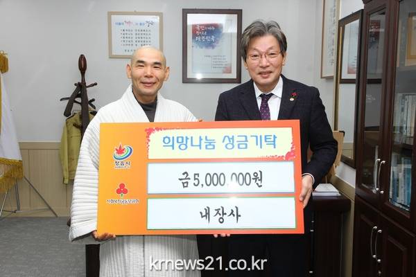(전북/뉴스21)김문기기자=대한불교조계종 내장사(주지 도완 스님)는 지난 11일 정읍시청을 방문하여 희망나눔 성금 500만원을 전달했다.