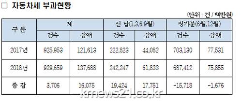 감소원인은 자동차세 연세액을 미리 납부한 연납차량의 증가에 따른 것으로, 자동차세 연납은 연간 납부할 세액을 미리 납부하면 세액의 10%를 할인해 주는 제도다.
