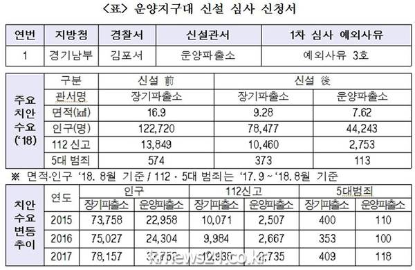 그 동안 운양파출소 신설 계획은 번번이 경찰청 본청 심사를 통과하지 못한 바 있다. 하지만 홍철호 의원이 경찰청을 지속적으로 설득한 결과 지난 10월 30일 ‘파출소’보다 규모가 한 단계 큰 ‘지구대’로 신설 승인됐다.