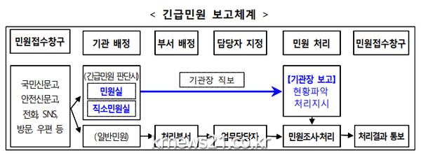 처리절차는 민원인이 긴급민원을 신고하면 민원실 또는 직소민원실에서 우선 기관장에게 직접 보고하고 기관장은 상황에 따라 처리부서에 현황파악 및 처리를 지시토록 절차를 간소화했다.