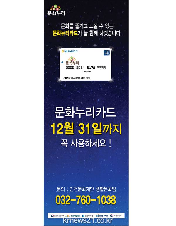 ▲ (사진=인천문화재단)인천문화재단은 기초수급자 및 법정 차상위계층에게 발급한 ‘문화누리카드’를 오는 31일까지 사용해야 한다고 17일 밝혔다.