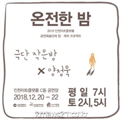 ▲ (사진=인천문화재단)2018년 인천아트플랫폼 9기 공연예술 입주단체의 올해 마지막 창작 작품이 무대에 오른다. 예술가 레지던시 프로그램을 중심으로 다양한 예술을 선보이는 인천문화재단-인천아트플랫폼(대표이사 나봉훈)은 공연예술 입주단체 창·제작 프로젝트의 마지막 창작 작품으로 ‘극단 작은방’의 <온전한 밤>을 오는 12월 20일(목) ~ 22일(토)까지 인천아트플랫폼 C동 공연장에서 관객들에게 선보인다.