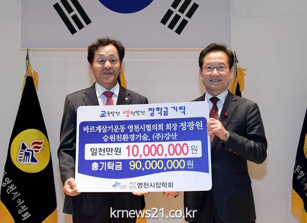 한편 14일 바르게살기운동 영천시협의회는 “2018 바르게살기운동 순회강연회 및 실천대회”에서 협의회장이신 승원친환경기술(주) 정광원 대표가1,000만원을 기탁해 총 9,000원을 기탁했으며, 바르게살기영천시협의회 임원일동도 200만원의 장학금을 보태어 왔다.