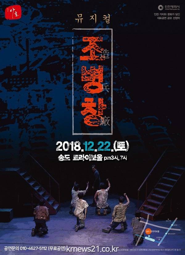 ▲ (사진=인천문화재단)(재)인천문화재단에서는 12월 22일 2018 인천 대표 공연콘텐츠 제작사업으로 진행되는 뮤지컬 <조병창> 공연을 선보인다. 2017년 공모를 통해 선발된 두 개의 시놉시스 중 하나로 인천 부평구에 세워진 무기공장 <일본육군조병창>을 배경으로 제작된 작품으로 일제 강점기 소시민으로 구성된 독립군들이 조병창을 폭파시키기 위해 고군분투하는 이야기를 중심으로, 독립군의 강인한 이미지와 대조되는 한 인간의 고뇌를 담고 있다.