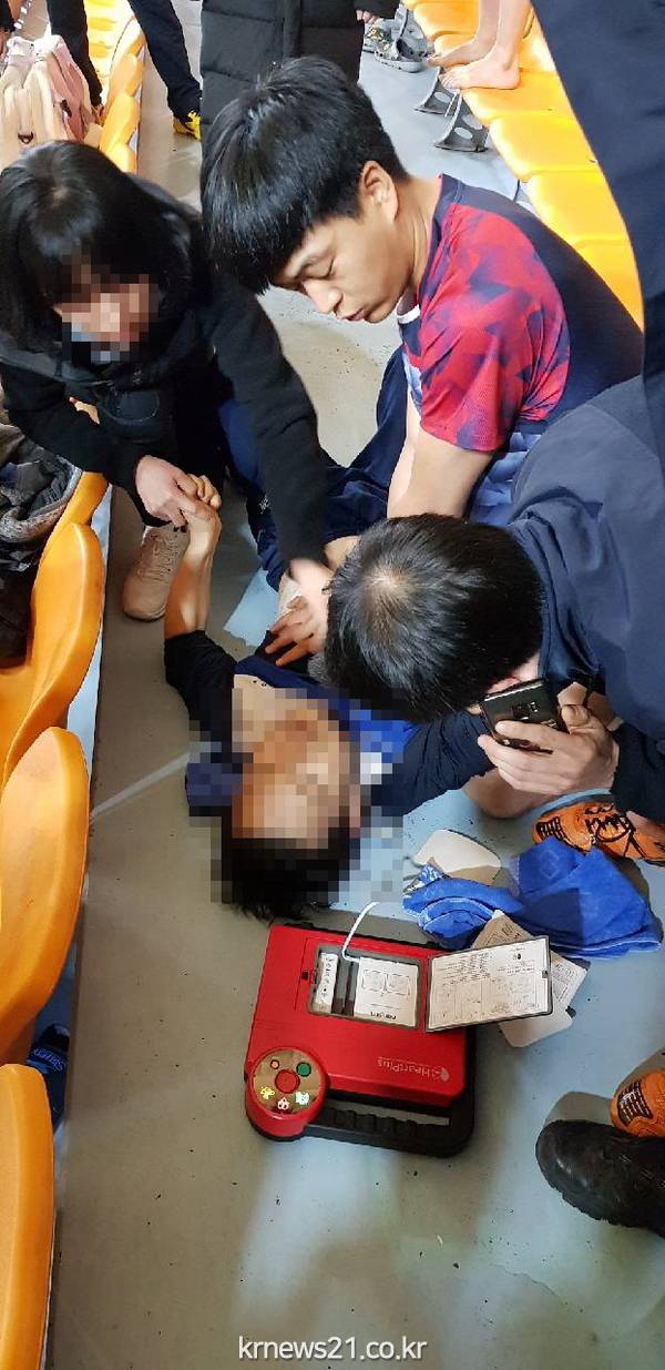 또한, 다른 회원들에게는 구급차를 현장에 안내토록 하고 다른 회원이 가져온 체육관 내 자동심장충격기로 구급차가 도착하기 전까지 심장충격기를 부착하고 심폐소생술을 실시했다.