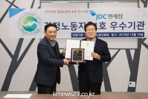 국내 최초 감정노동자보호 우수기관 인증사업을 진행하는 한국감정노동인증원(원장 박종태)이 출범 이후 국내 1호 감정노동자 보호 우수기관으로 JDC(제주국제자유도시 개발센터)면세점을 선정했다고 21일 밝혔다.
