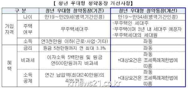 국토부 관계자는 “청년들의 주거 현실을 반영한 이번 청년 우대형 청약통장 가입요건 완화로 보다 많은 청년이 우대금리 혜택 등의 주거금융지원을 받을 수 있게 될 것”이라고 말했다.