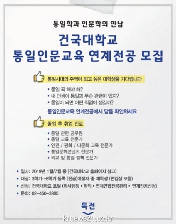 건국대학교 문과대학(학장 한상도)은 분단된 한반도에서 평화체제를 구축하고 통일을 지향하는 인문학적 통일교육 전문 인력을 양성하기 위해 2019학년도 1학기부터 ‘통일인문교육 연계전공’을 신설한다고 밝혔다.