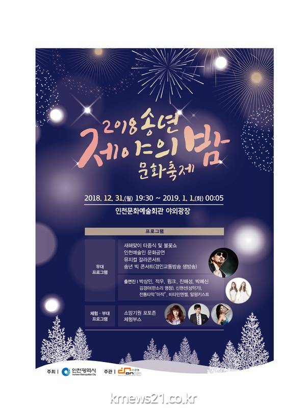 ▲ (사진=인천광역시청)인천시(시장 박남춘)가 12월 31일 인천시민이 함께 모여 한 해를 마무리하고 희망찬 2019년(己亥年) 새해를 맞이하는 송년제야의 밤 문화축제를 인천문화예술회관 야외광장 특설무대에서 개최한다고 27일 밝혔다.