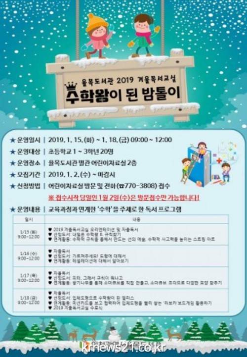 ▲ (사진=인천광역시청)인천광역시가 설립하고 인천광역시도서관발전진흥원이 운영하는 율목도서관(관장 김태경)은 겨울방학을 맞아 독서의 즐거움을 발견하고 자발적인 독서 습관 형성을 돕기 위해 겨울독서교실 ‘수학왕이 된 밤톨이’를 초등 1~3학년 20명을 대상으로 1월 15일(화)부터 18일(금)까지 총 4일간 운영한다.
