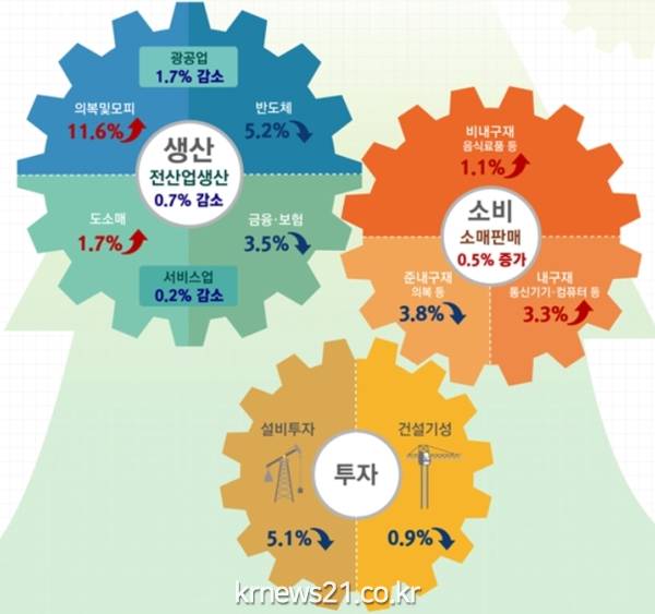 어운선 통계청 산업동향과장은 " 지난달은 광공업·서비스업 생산 모두 감소해 전체 생산이 감소로 전환했다"며 "소매판매는 증가했지만, 설비·건설 투자가 좋지 않은 탓에 부진한 모습이 이어졌다"고 말했다.