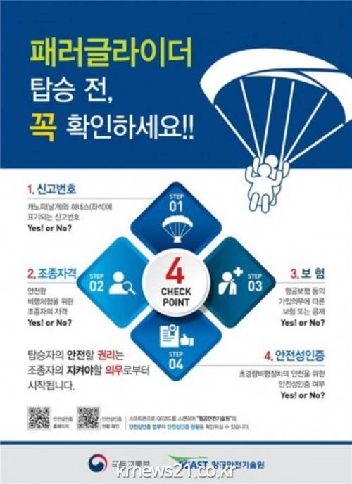 항공안전기술원(원장 김연명)은 항공레저스포츠사업에 사용되는 패러글라이더 비행안전 홍보의 일환으로 패러글라이더 비행 시 주요 확인사항을 리플릿과 포스터로 제작해 21일 배포하였다.