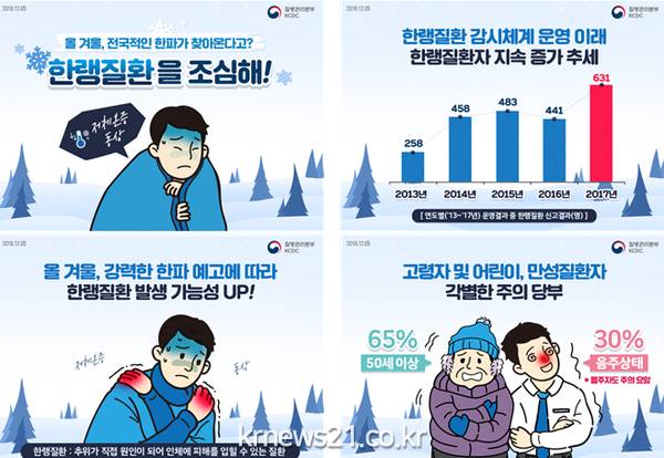 ▲ (사진=질병관리본부)제주특별자치도는 12월 27일 밤을 기하여 제주도산간에 대설특보가 발효되는 등 1월 2일까지 한파가 예고됨에 따라 한랭질환에 대비하여 건강관리에 유의할 것을 당부하고 있다.