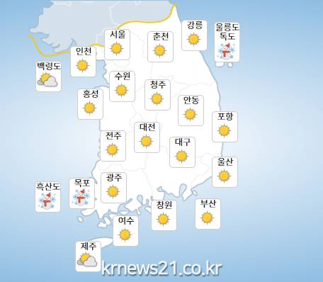 아침 최저기온은 △서울 -11도 △대전 -9도 △대구 -7도 △전주 -6도 △광주 -5도 △부산 -5도 △춘천 -15도 △강릉 -6도 △제주 2도 △울릉도·독도 -3도, 낮 최고기온은 △서울 -3도 △대전 -1도 △대구 1도 △전주 0도 △광주 1도 △부산 4도 △춘천 -2도 △강릉 2도 △제주 5도 △울릉도·독도 0도 등이다.