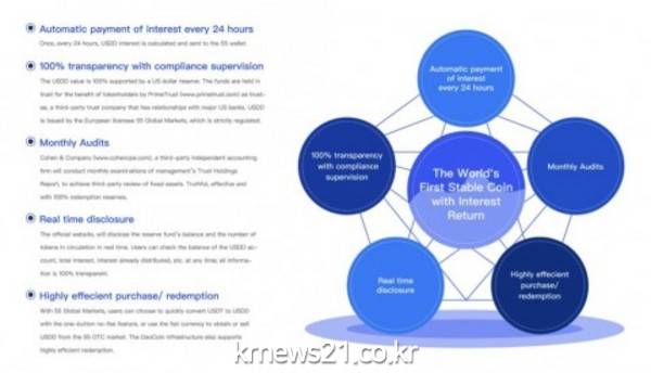 글로벌 암호화폐 투자자들은 투명하고 효율적인 스테이블 코인을 선호한다. 그 이유는 시장 변동에 따른 위험을 낮출 수 있고 또 위험도가 높은 보험을 가지고 있을 때 이윤 기대와 자금 사용률을 극대화할 수 있기 때문이다. 이러한 수요에 기초해 55 글로벌 시장은 DaoCoin 기초 인프라를 이용해 투명하고 고수익의 안정 코인 USDD를 발행했다. USDD는 24시간 자동 지급되며 가치는 100% 달러로 지탱된다. 자금은 제3자인 미국 신탁회사 PrimeTrust가 관리 및 합법 감독을 하며 실시간 계좌 잔액과 발행 수량을 공개한다. 회계감사는 Top 회계법인 AICPA(미국 공인 회계사) 기준에 따라 매월 주기적으로 시행한다.