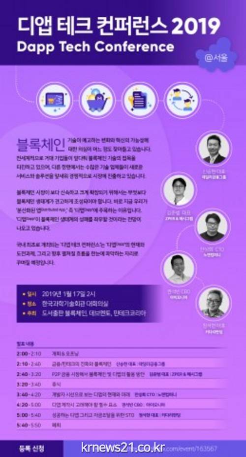 한편 국내 처음으로 디앱 테크를 메인 테마로 진행되는 ‘디앱 테크 컨퍼펀스 @서울 2019’에 대한 상세한 내용은 도서출판 블록체인 웹사이트나 온오프믹스를 통해 확인할 수 있다.