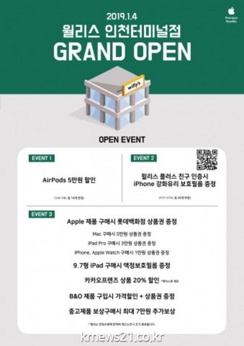 매장 오픈일인 4일부터 6일까지는 매일 에어팟 10대 한정, 선착순 5만원 할인을 제공한다. 7일부터 13일까지는 매일 선착순으로 매장을 방문한 30명의 고객 가운데 카카오톡 플러스친구에 윌리스를 등록한 고객에 한해 foxlab iPhone XS, XS Max, XR, X, 8 Plus, 8용 프리미엄 아이폰 강화유리 보호필름과 부착 서비스를 제공한다.