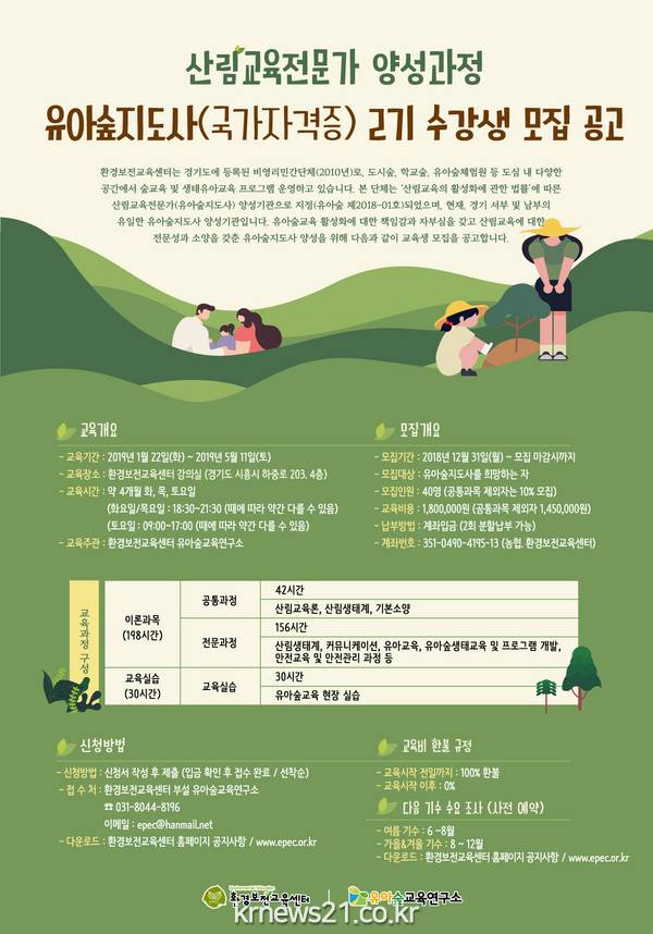 환경보전 교육센터의 ‘유아숲지도사 2기 양성과정’은 1월 22일부터 5월 11일까지 매주 화(야간)·목(야간)·토요일(주간) 이뤄집니다. 이론 및 실습교육 198시간, 교육실습 30시간 등 모두 228시간 운영합니다. 산림교육전문가 공통과정 및 유아숲지도사 전문과정을 이수한 뒤 이론평가·시연평가를 통과하면 자격증이 발급됩니다.