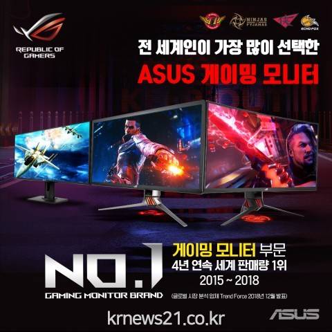 에이수스의 최고급 게이밍 브랜드인 Republic of Gamers(이하ROG)가 4년 연속으로 게이밍 모니터 세계 판매량 1위의 자리를 지켰다. 글로벌 시장 전문 분석업체인 Trend Force에서 제공하는 Wit's view 리포트에 따르면 에이수스는 2015년부터 2018년까지 총 4년 연속 세계 점유율 1위를 달성했다고 밝혔다.